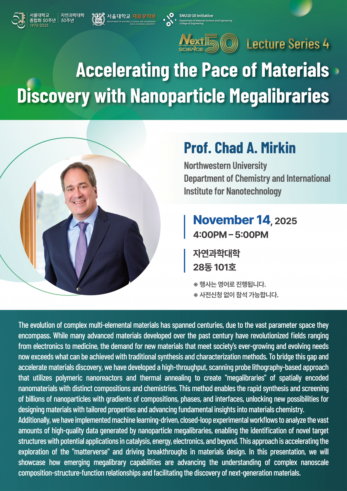 자연과학 분야의 석학을 초청하여 학문적 통찰을 공유하는 'Science, Next 50' Lecture Series 4를 진행합니다.