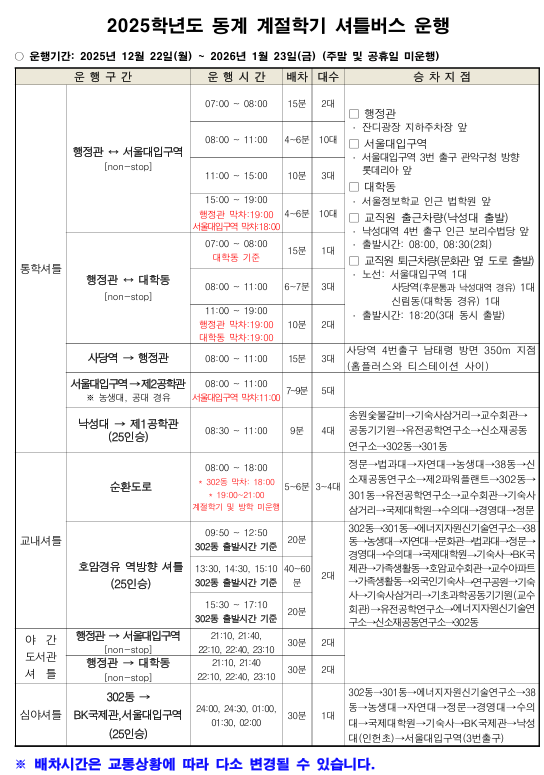 2025학년도 동계 계절학기 및 방학 셔틀버스 운행을 안내드리오니 참고 바랍니다.