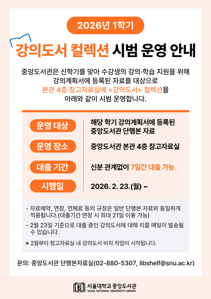 중앙도서관에서 신학기를 맞아 수강생의 강의학습 지원을 위해 아래와 같이 2026년 1학기 강의도서 컬렉션을 시범 운영하오니 참고 부탁드리겠습니다.