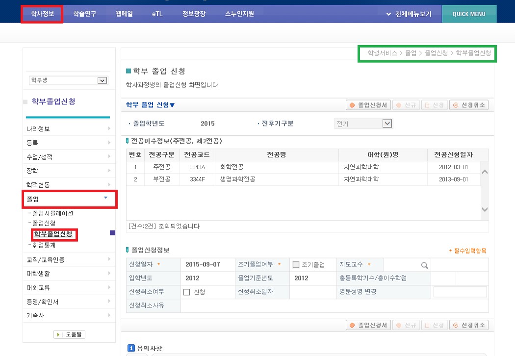 - 졸업 신청서를 제출하지 않으면 졸업대상자에서 제외되오니, 각별히 유의바랍니다.
