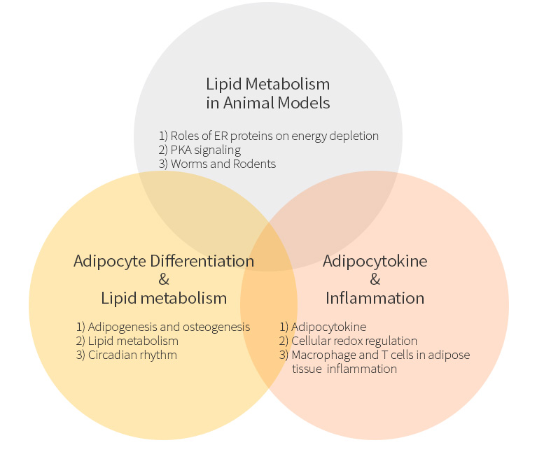 In LAMR, we are interested in the regulation process of energy metabolism. To investigate our research interest, we are using various cell lines and specific gene knock-out mouse for deficient and overexpressed gene models, and nematodes for genetic screening model. Our aim is to discover the molecular mechanisms behind metabolic diseases resulting from an unbalanced energy metabolism and the process by which lipid metabolism and glucose metabolism are integrated in metabolic tissues such as adipose tissue, liver, pancreas, kidney, etc.